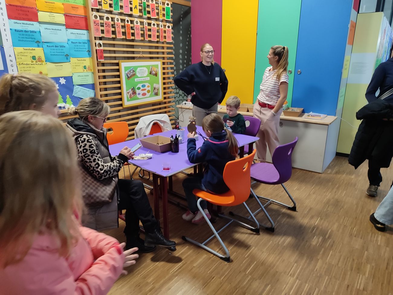 engagieren sich, schmücken, übernehmen Helferschichten, richten Klassenzimmer her, bieten Mitmachaktionen an, geben Essen aus, führen Gespräche...