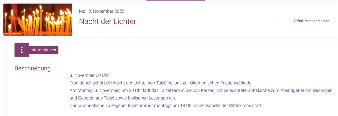 Am Montag, 3. November, um 20 Uhr lädt das Taizéteam in die von Kerzenlicht beleuchtete Stiftskirche zum Abendgebet mit Gesängen und Gebeten aus Taizé sowie biblischen Lesungen ein.